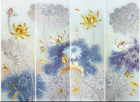 淡雅的百合、傲放的梅花、璀璨的桃花……現(xiàn)代浪漫型藝術(shù)玻璃多采用夾膠工藝制作,也有部門(mén)是在中間夾上碎玻璃,玻璃的內(nèi)面采用淺雕工藝雕刻花朵圖案,由雙層與三層玻璃制成,玻璃表面采用如水波浪的凹凸紋裝飾,再結(jié)合噴砂工藝,在花朵圖案上面灑上閃閃發(fā)光的微晶粉,從而營(yíng)造出清新淡雅浪漫旖旎的迷離風(fēng)光。